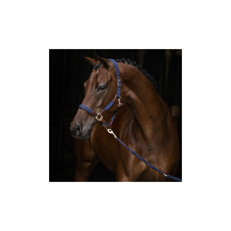 Piękny kantar wykonany z materiału, wykończony delikatnymi, skórzanymi elementami najwyższej jakości. Miękkie podszycie na pasku nosowym i potylicznym.