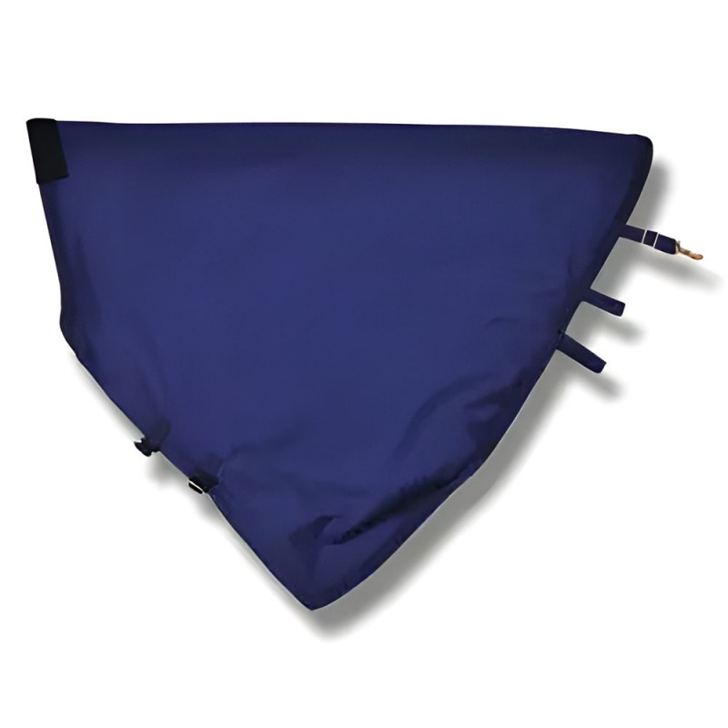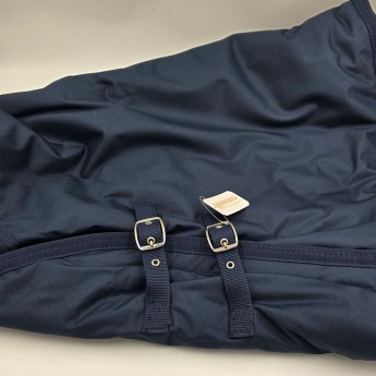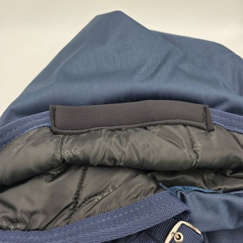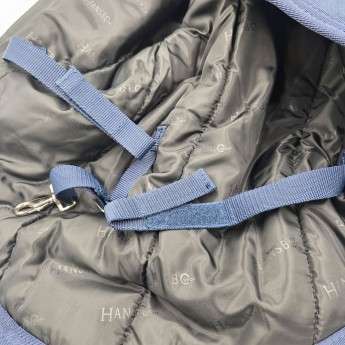 Kaptur w klasycznym, granatowym kolorze (marin) łatwo dopasować do większości derek stajennych i padokowych. Przypinany jest do derki centralnym paskiem z karabińczykiem oraz dwoma paskami z rzepami po bokach, co zapewnia stabilność i szybki montaż. Pod szyją zapinany na dwie klamry, co sprawia, że zakładanie i zdejmowanie kaptura jest wyjątkowo łatwe i wygodne.
